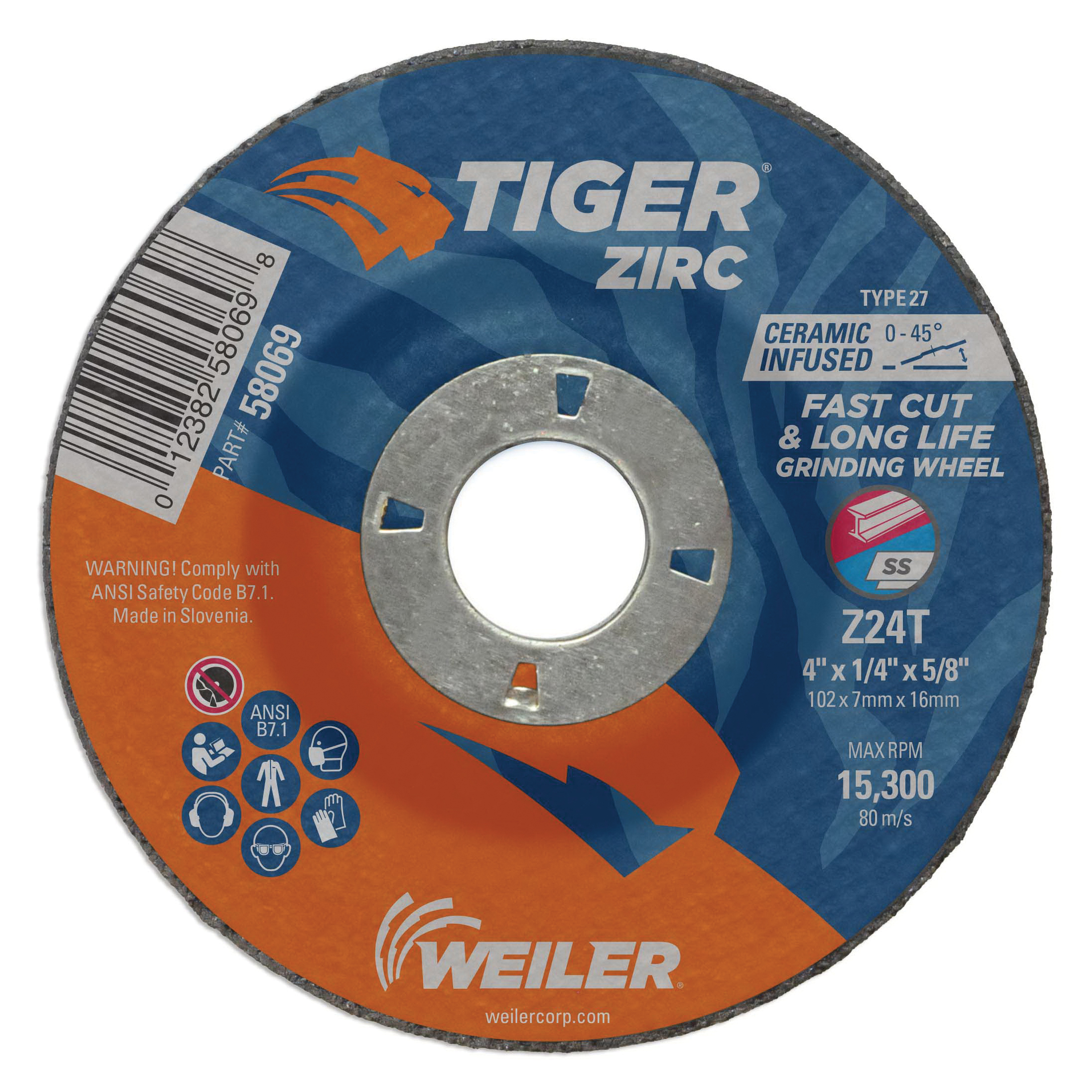 Tiger® Zirc® 4 in type 27 grinding wheels cut faster and last longer so you get proven productivity at an exceptional total cost. The self-sharpening zirconia alumina grains retain a high cut rate throughout the life of the wheel while a hard bond delivers long wheel life for heavy duty applications. The flat profile with depressed center allows for a wide range of grinding angles (0 to 45deg). 1/4 in wheel thickness is ideal for heavy stock removal, scale removal, weld removal, weld blending, edge beveling and torch-cut softening with a grinder. The 5/8 in open arbor offers a cost-effective mounting option when using adapting nuts.