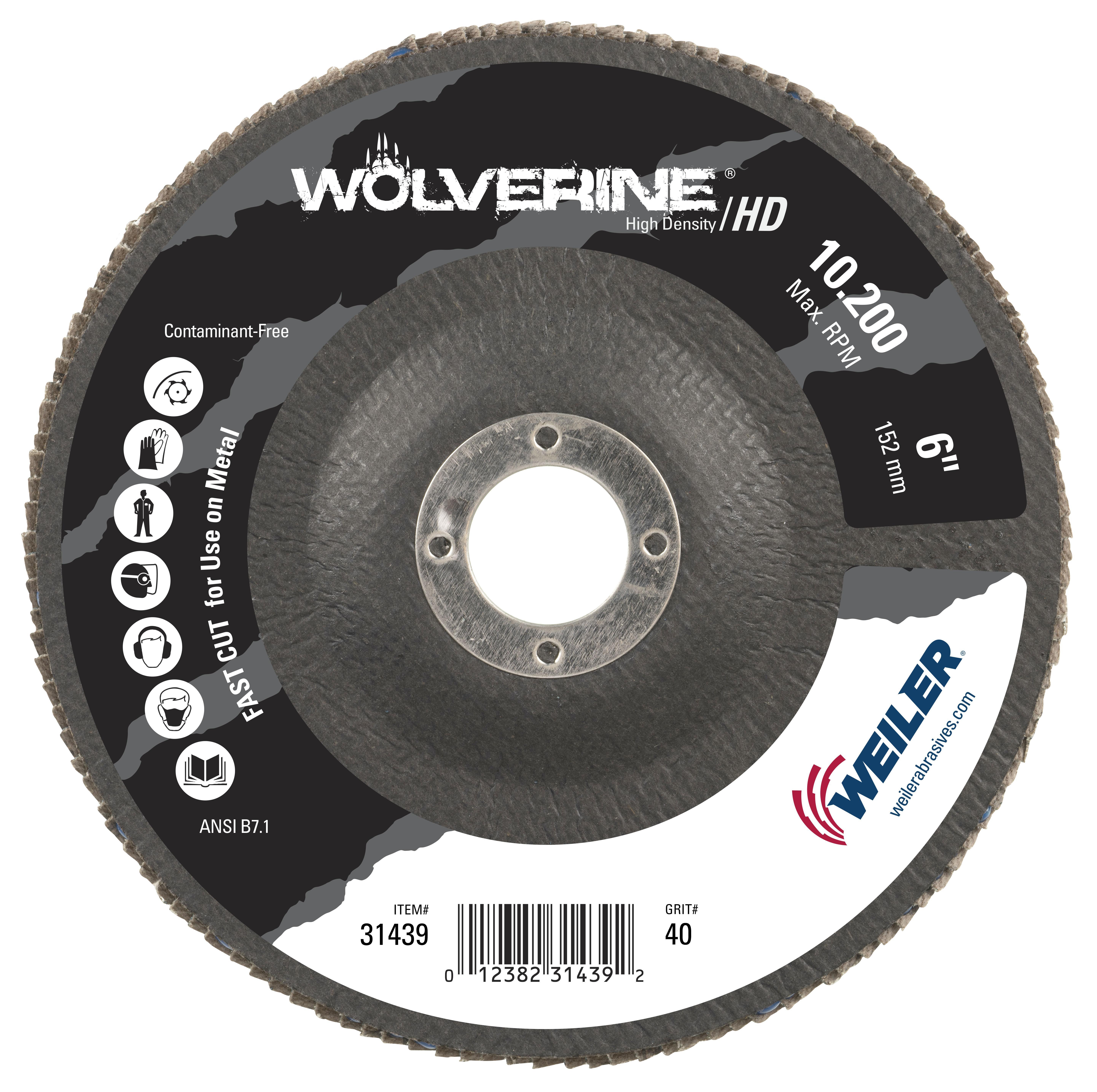 Weiler Wolverine™ 6 in high density flap discs deliver a fast cut rate and consistent performance at a good value when grinding steel and other metals. The high density flap design is conformable to irregular surfaces while the flat type 27 disc shape is ideal when grinding between 0 to 15 deg. The 40 grit abrasive grain is best for edge beveling, chamfering, weld grinding and blending with an angle grinder.