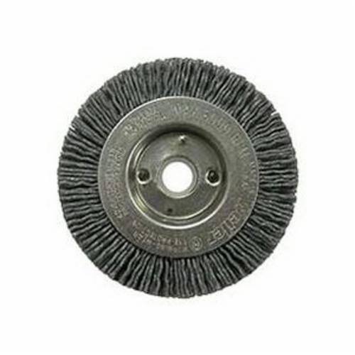 Nylox® Burr-Rx® Wheel Brush, Narrow Face, 4 in Brush Dia, 1/2 in Face Width, 1/2 to 3/8 in Arbor Hole Size, Crimped/Round Filament/Wire, 0.043 in Filament/Wire Diameter, Ceramic Fill, 7/8 in Trim Length, 6000 rpm Maximum, Unthreaded Arbor Attachment