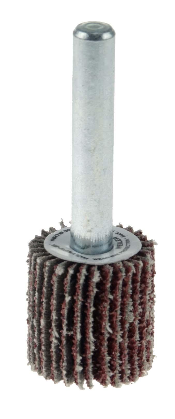 Weiler® Wolverine™ aluminum oxide 3/4 in coated abrasive flap wheels provide fast cutting at a value price on steel and other metals. The 1/4 in stem allows for easy mounting on a die grinder or right angle die grinder. The flap wheel can be dressed to conform to an application part. A solid hub construction increases balance and reduced vibration in applications such as tube ID cleaning, thread cleaning and deburring.